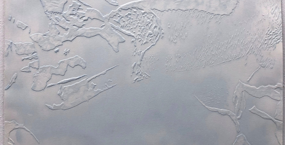 I lightly inked my large woodblock with an icy blue watercolour and used the hydraulic press again to emboss into damp 600gsm Somerset. I was worried the paper fibres would stick, but the embossing worked well. It reminds of how I feel when I am carving the block: as if I am creating landmasses and archipelagoes.